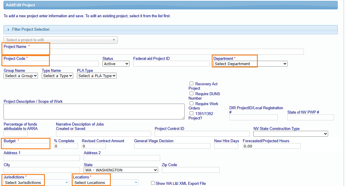 The orange highlighted field is a requirement for projects located within the state of California ONLY and requires checks against CA state prevailing wages.