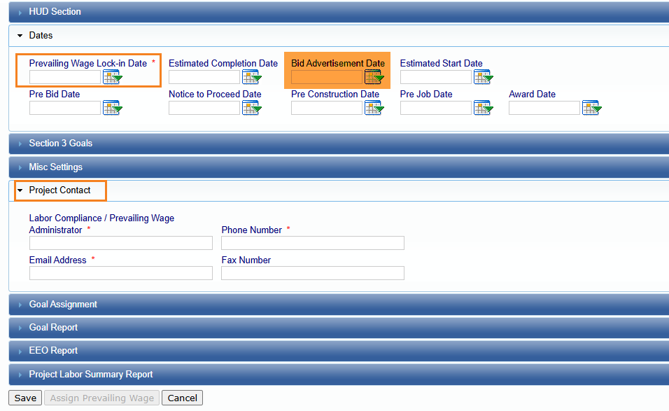 - Project Contact section – This section requires name, phone number and email address of the Labor Compliance/Prevailing Wage Administrator. It may also be the Prime Approver if using that functionality. The information entered here will be visible to the Contractor on their landing page.