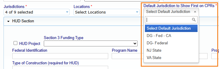 Selecting two or more Jurisdictions will prompt the "Default Jurisdiction to Show First on CPRs" box. You can choose which jurisdiction craft/classification is listed first on your certified payroll reports.