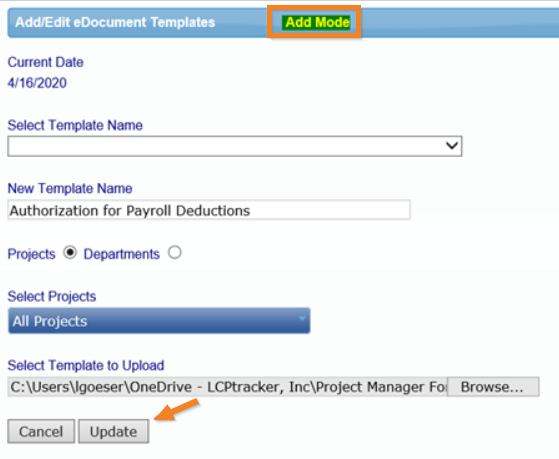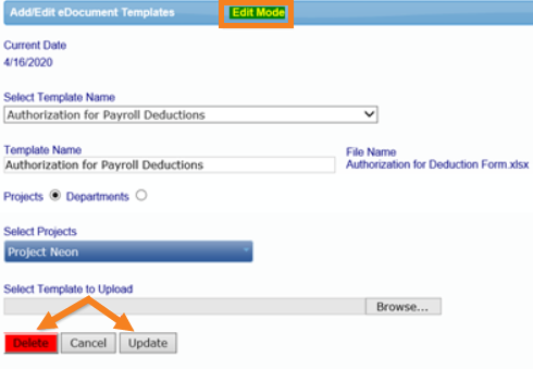 - Choose field you wish to edit (Name, Projects / Departments, or file – browse for template needing to update).