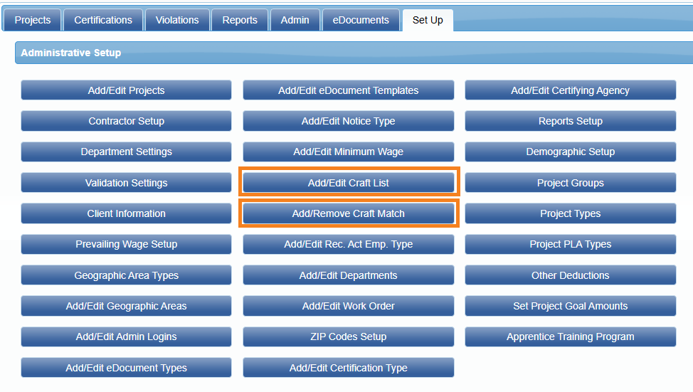 Craft Matching needs to be completed for the FHWA reports to pull correctly. There are two parts to Craft Matching. Part 1 is reviewing that the standard FHWA Craft List is loaded into your account and Part 2 is matching submitted crafts to a broad craft from the preloaded FHWA Craft List.