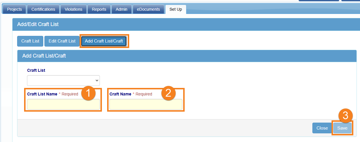 From the ‘Set Up’ tab, click ‘Add/Edit Craft List’ then click ‘Add Craft List/Craft’ to create a new Craft List name.