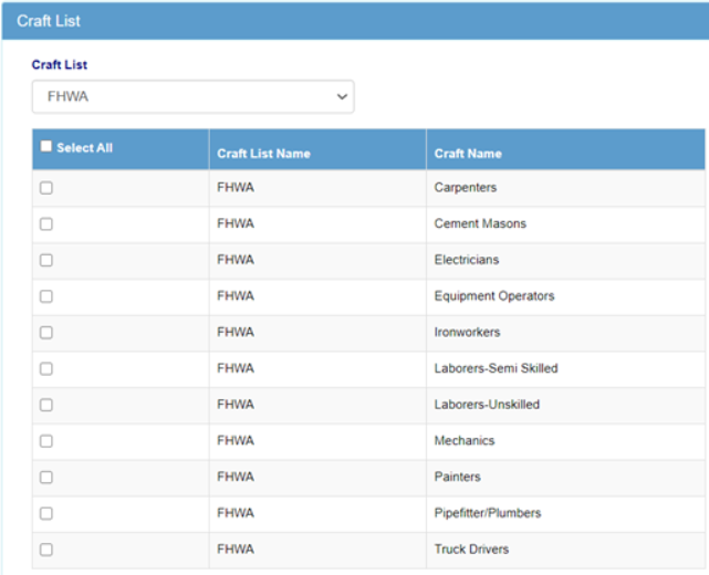 The FHWA Craft List will be pre-populated in DOT accounts that have the jurisdiction set to yes for FHWA.