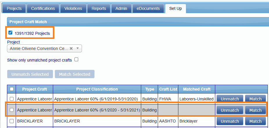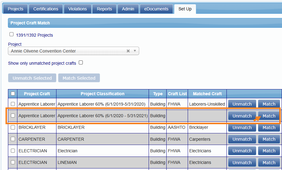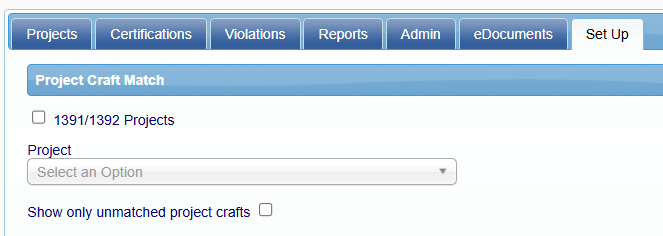 The system will list all available classifications on a project so administrators can preemptively handle the craft matching process. It is important to note, if a new classification is added to the project, the administrator will need to go back to this list to complete the craft match for that newly added classification.