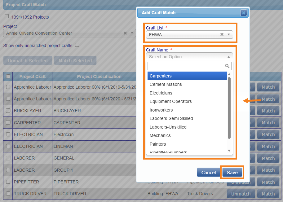 For FHWA reporting, using the matching functions in LCPtracker allows prevailing wage craft categories to be matched with the predetermined FHWA reporting craft categories. The FHWA provides a standardized list of eleven trades that all craft/classifications on certified payroll reports (CPRs) must be matched to.