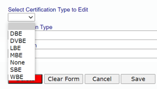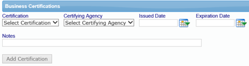 In this area, you have the ability to add additional Business Certification Types you may want to assign to your contractors. An Admin will first need to setup the Business Certification before it will show in the drop down for the Business Certification section under Contractor Setup.