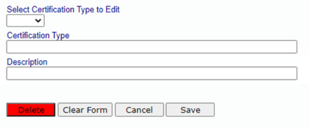 To add a new option, simply enter the Certification Type and Description. Then click Save. If you have multiple certifications to add, after you have saved your entry, click Clear Form to add another entry.