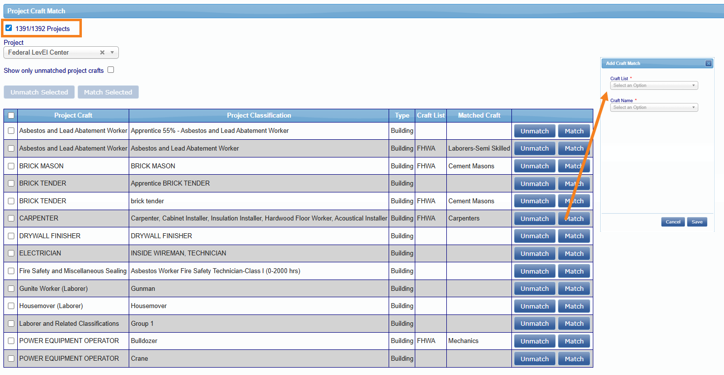 Una vez que los CPRs hayan sido ingresados, el administrador de la base de datos deberá revisar y craft match los oficios utilizados en el sistema con los oficios FHWA via Set Up>Add/Remove Craft Match. Marque 1391/1392 Projects y luego seleccione el rango de fechas de los CPRs desde los cuales desea extraer la información de los oficios.
