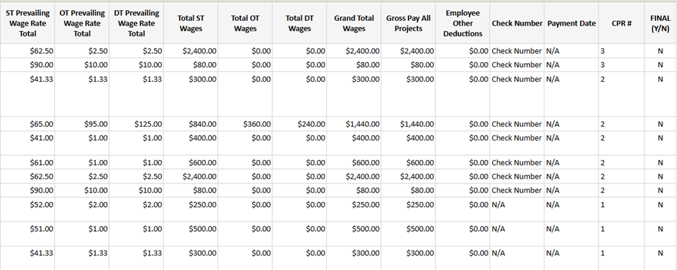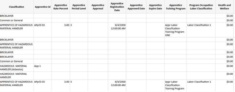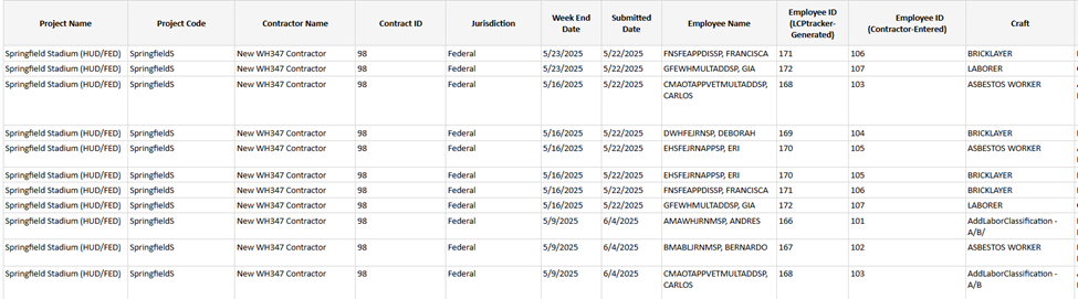 Descripción del Informe: este informe le proporciona un desglose de los empleados individuales para la fecha de finalización de la semana que especifique, por proyecto y por contratista, junto con la información de sus aprendices si está disponible*. Muestra la siguiente información: